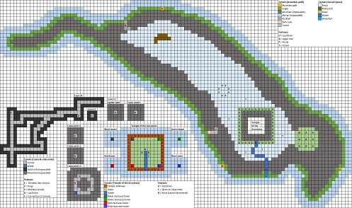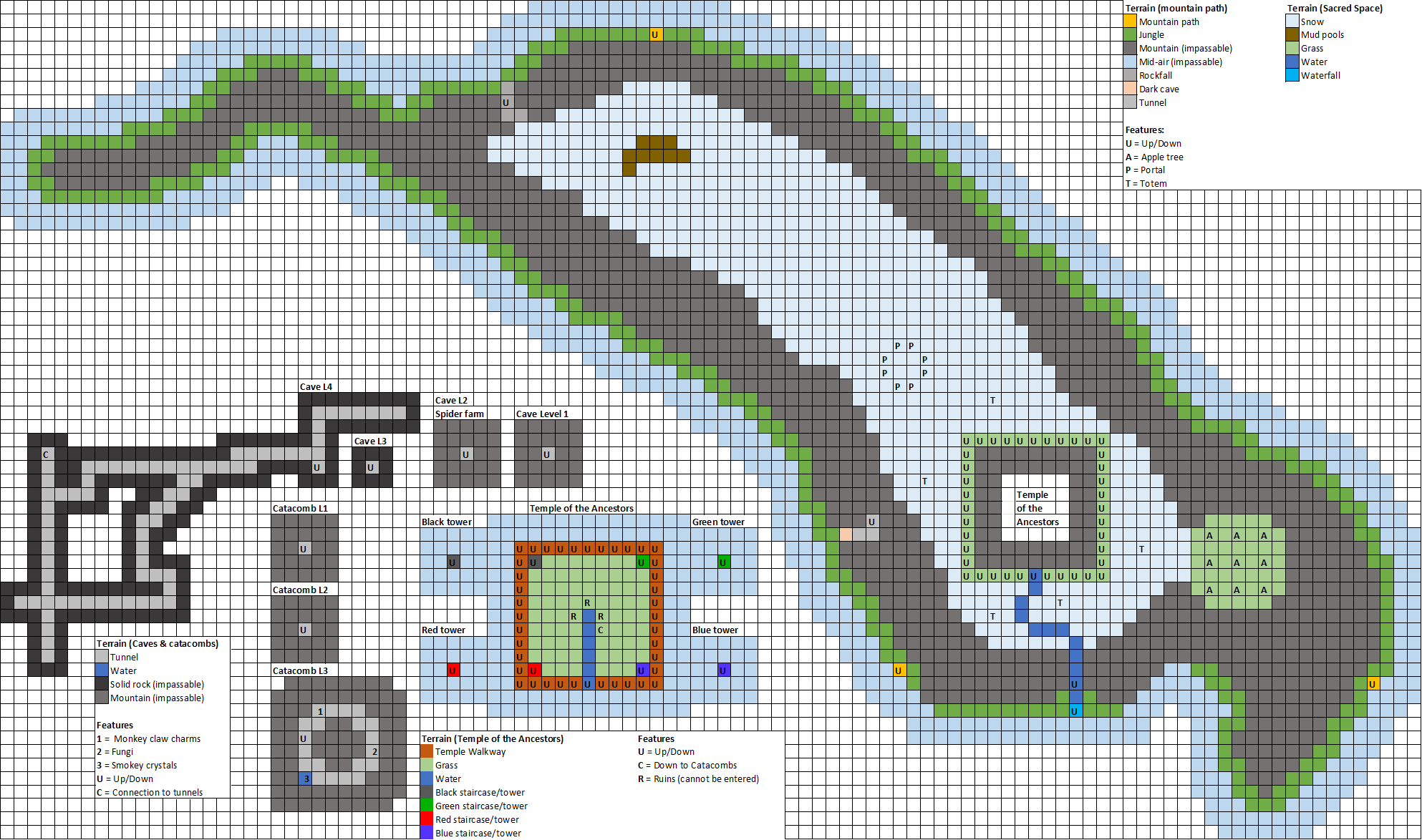 | Low resolution map of the mountain path and Sacred Space, including the mountain cave, Temple of the Ancestors and catacombs. Full resolution map is available here. |